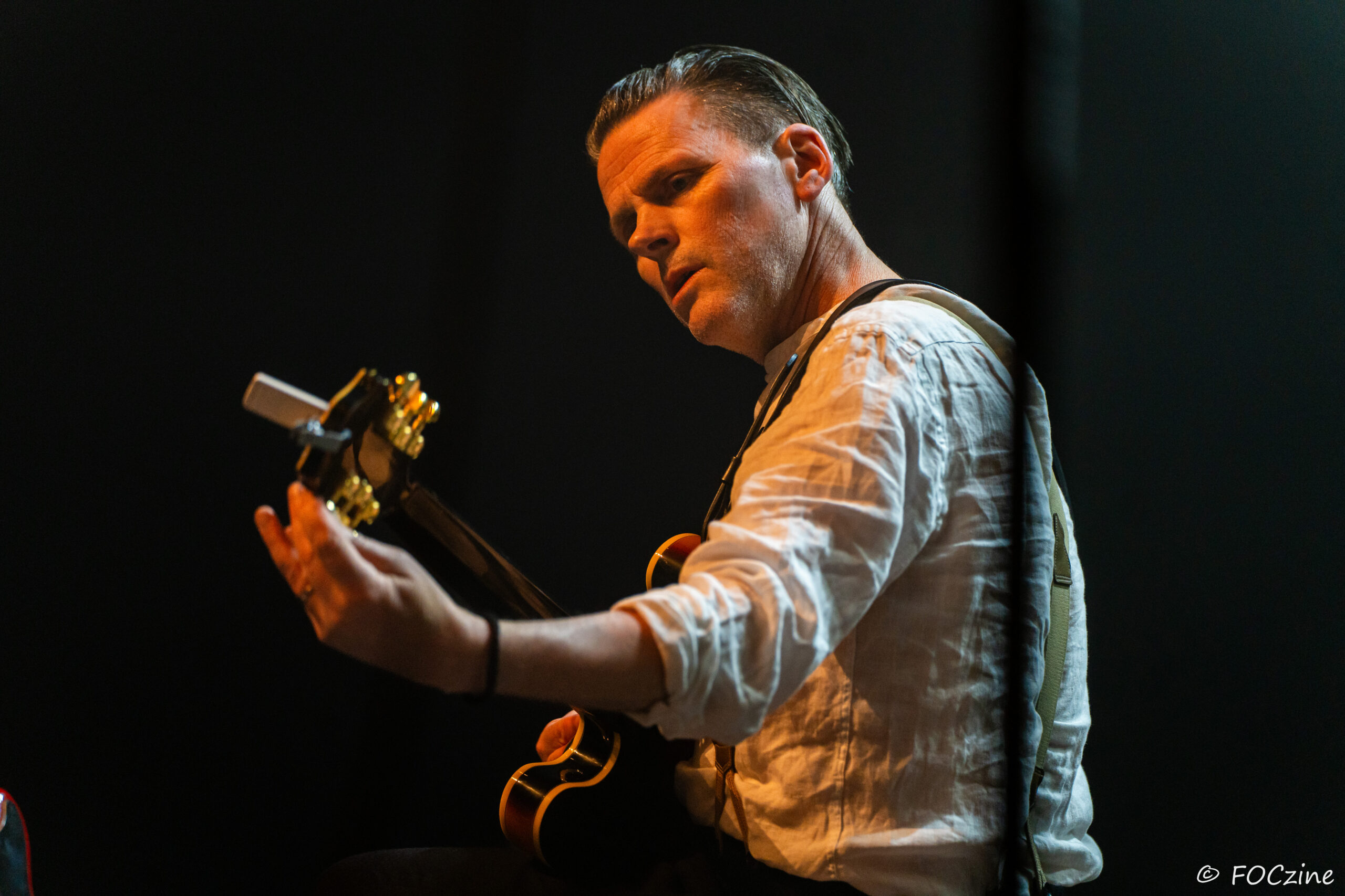 Justin Jones ouvre seul avant d’être rejoint par le groupe. La coupe de cheveux est impeccable, l’homme est très élégant et sa guitare très expressive. Elle ronronne telle une mandoline, un son singulier, signature sonore des And Also The Trees . De temps en temps elle échappe à son accent anglais pour conquérir des territoires plus au sud et emprunter des riffs presque flamenco. Puis le rejoignent :