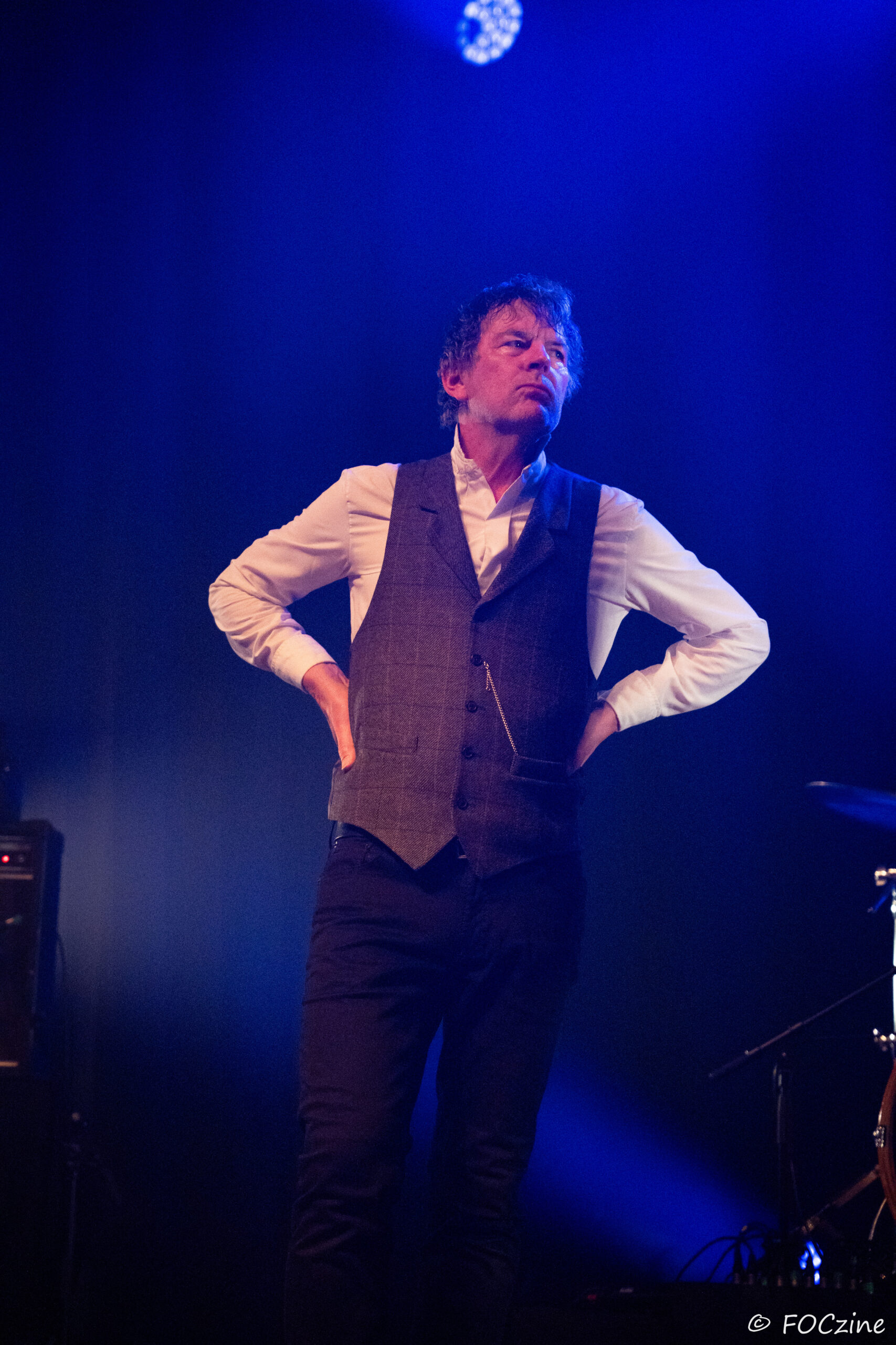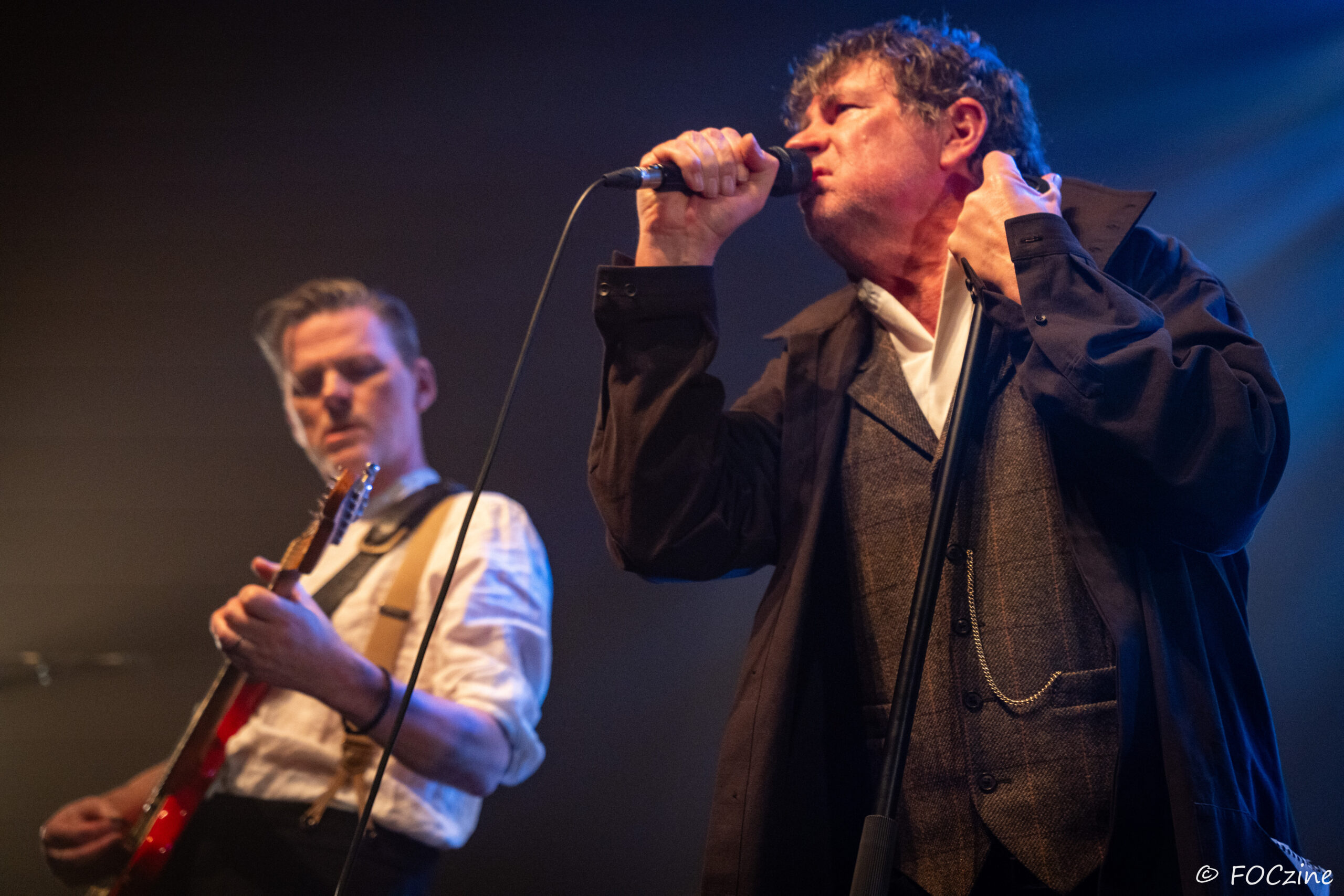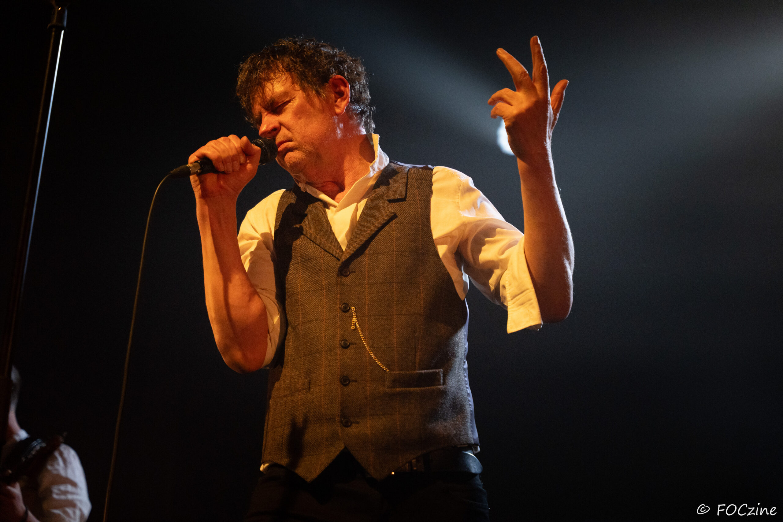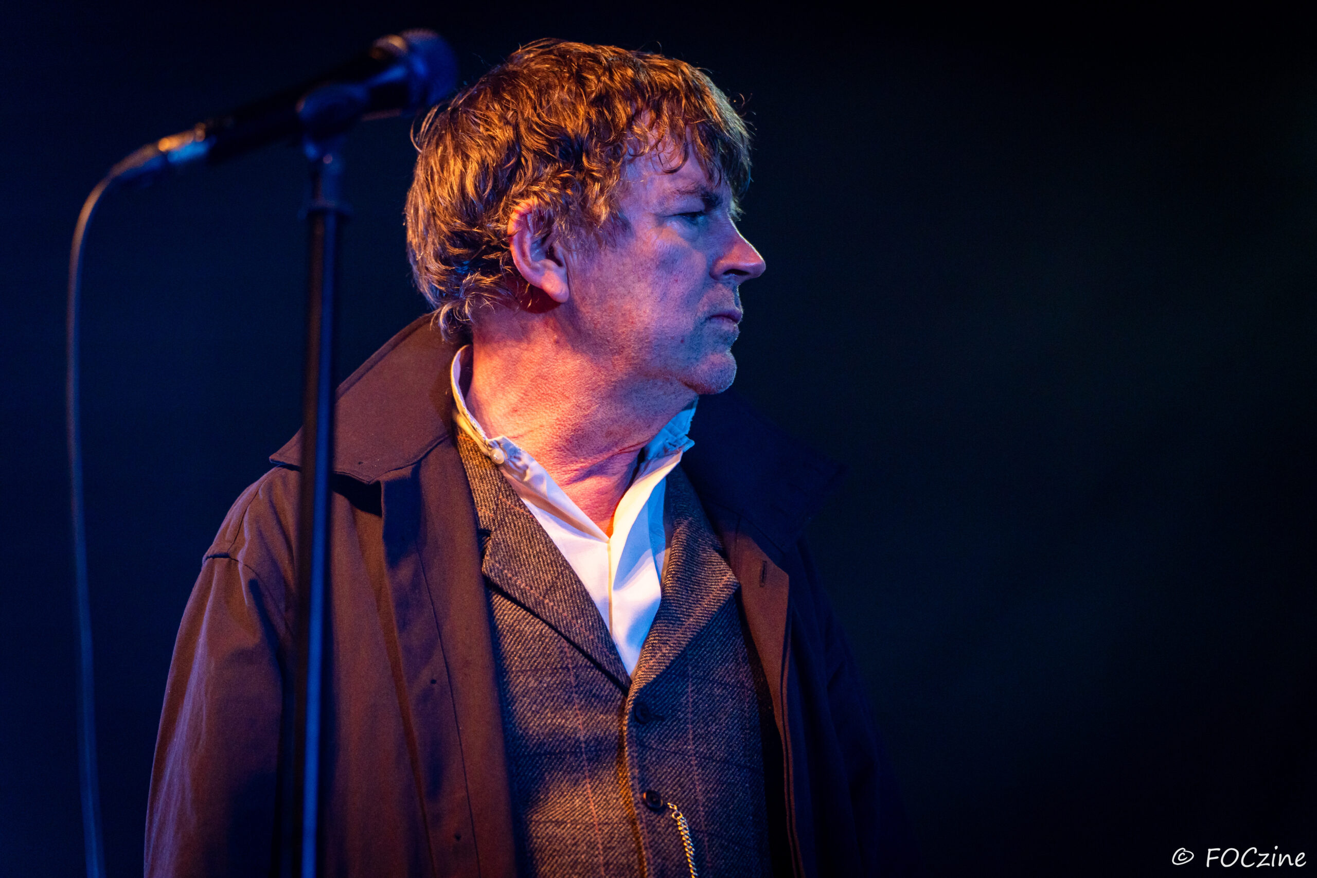 Et enfin Simon Huw Jones : le grand frère, la figure de proue, le capitaine au chant incarné. Un acteur entre en scène, redingote sur chemise blanche, col tendu. Passeur de temps, montre à gousset dans la poche du blaser et gestuel théâtral.