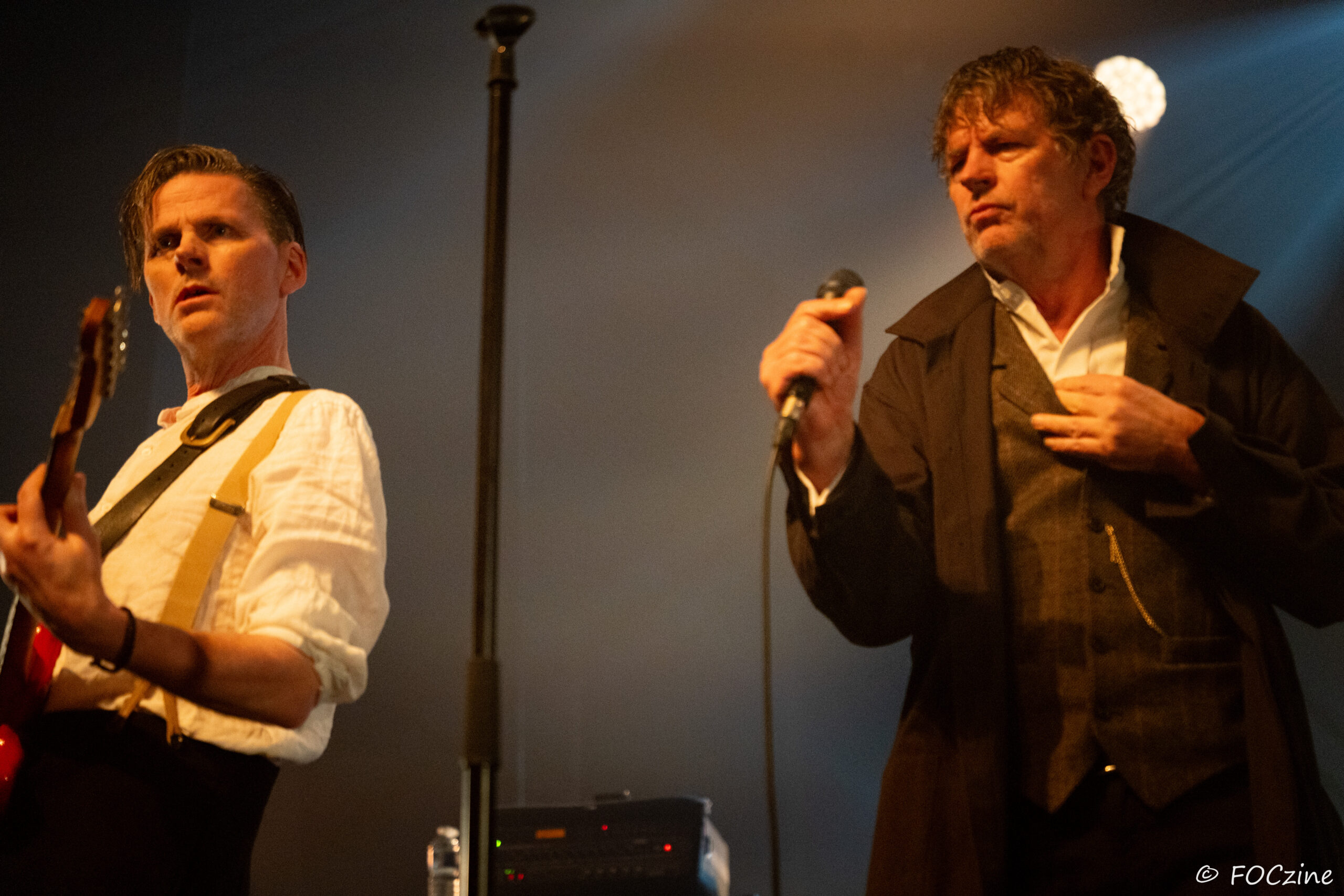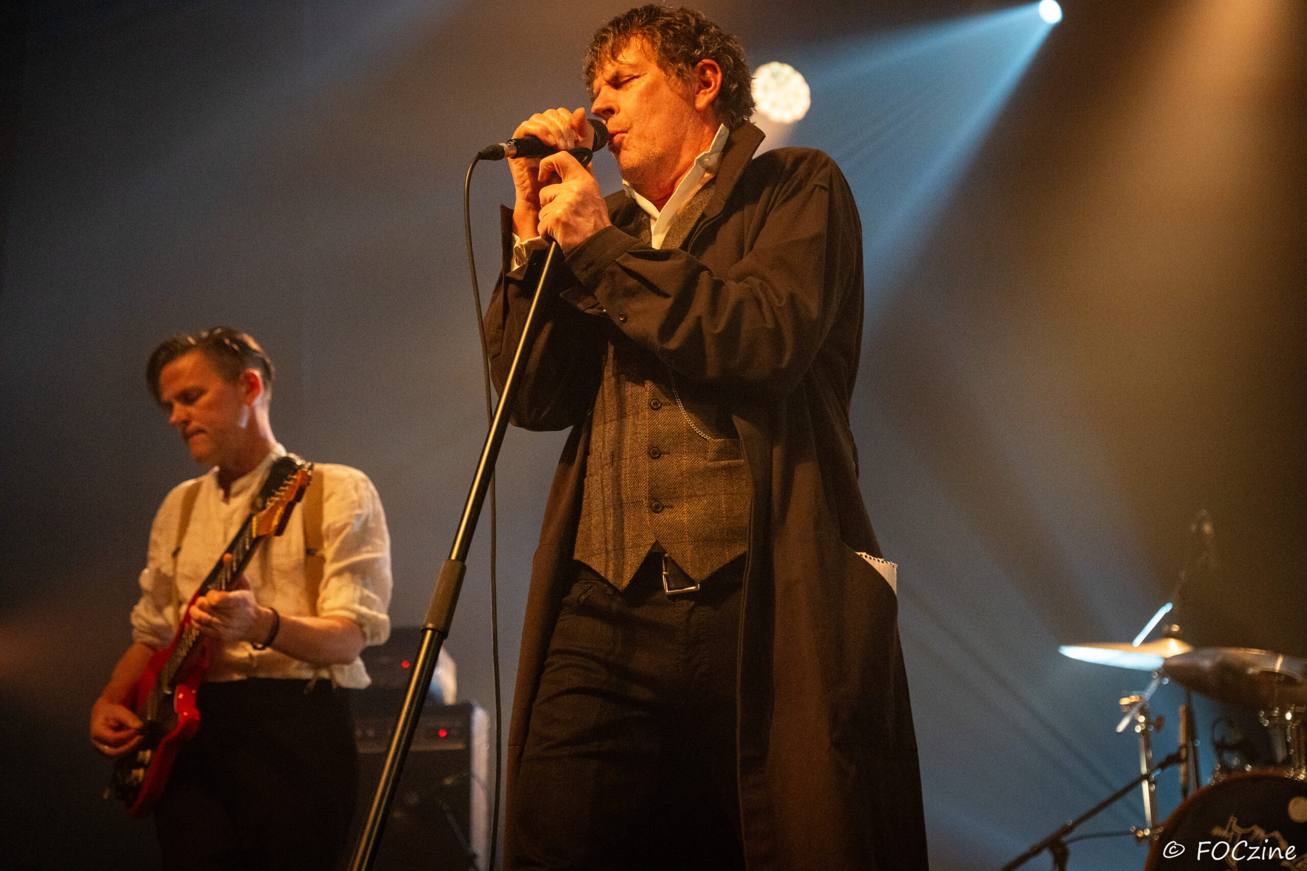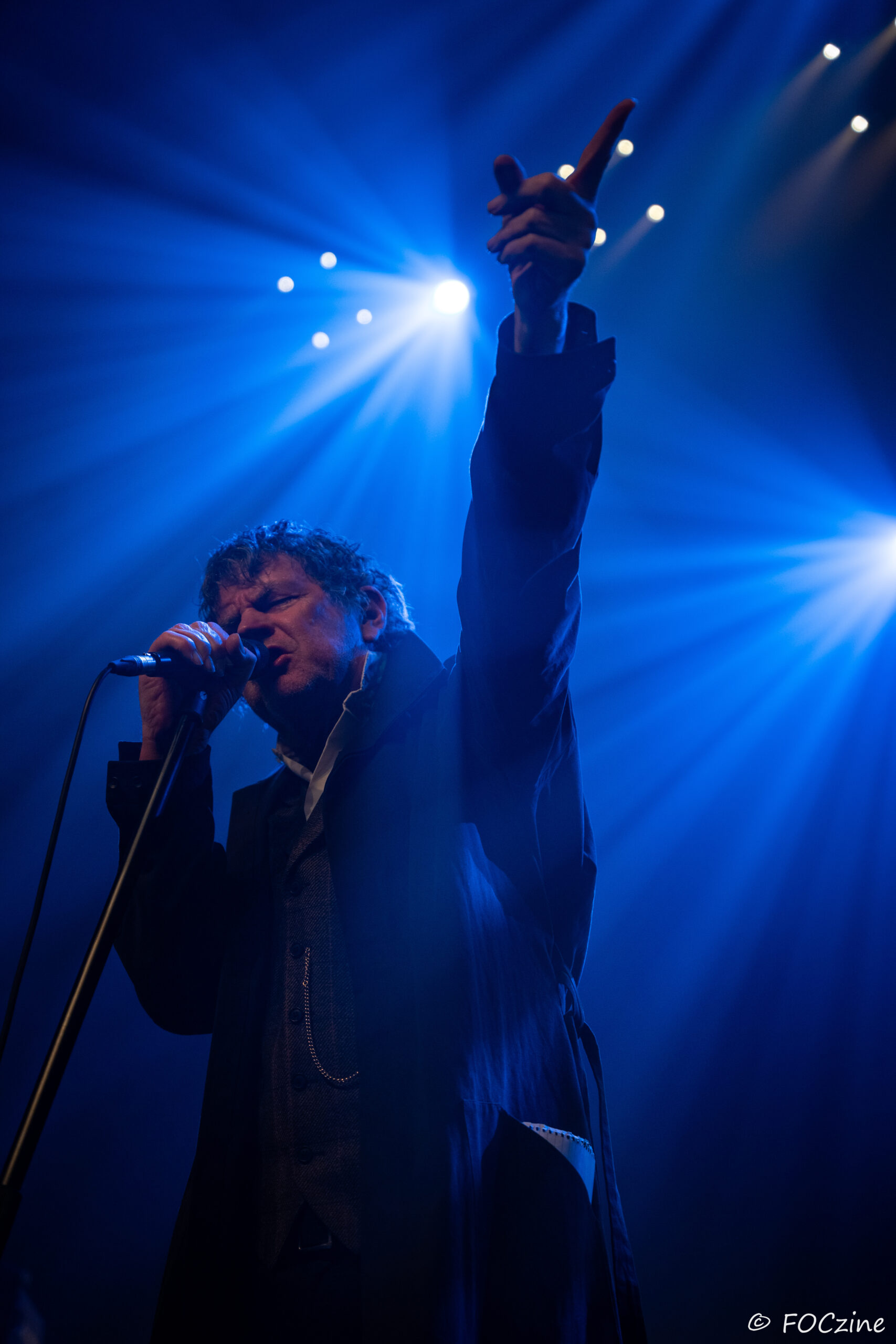 Et enfin Simon Huw Jones : le grand frère, la figure de proue, le capitaine au chant incarné. Un acteur entre en scène, redingote sur chemise blanche, col tendu. Passeur de temps, montre à gousset dans la poche du blaser et gestuel théâtral.