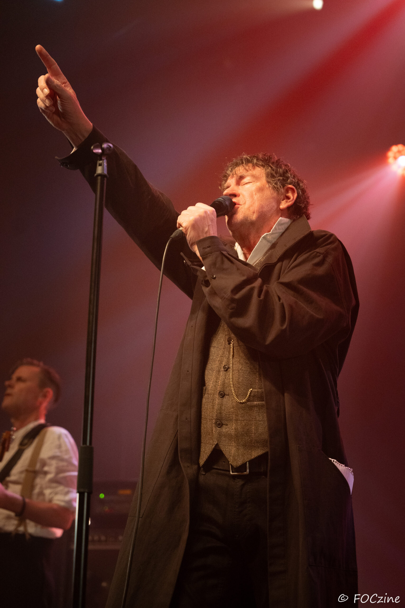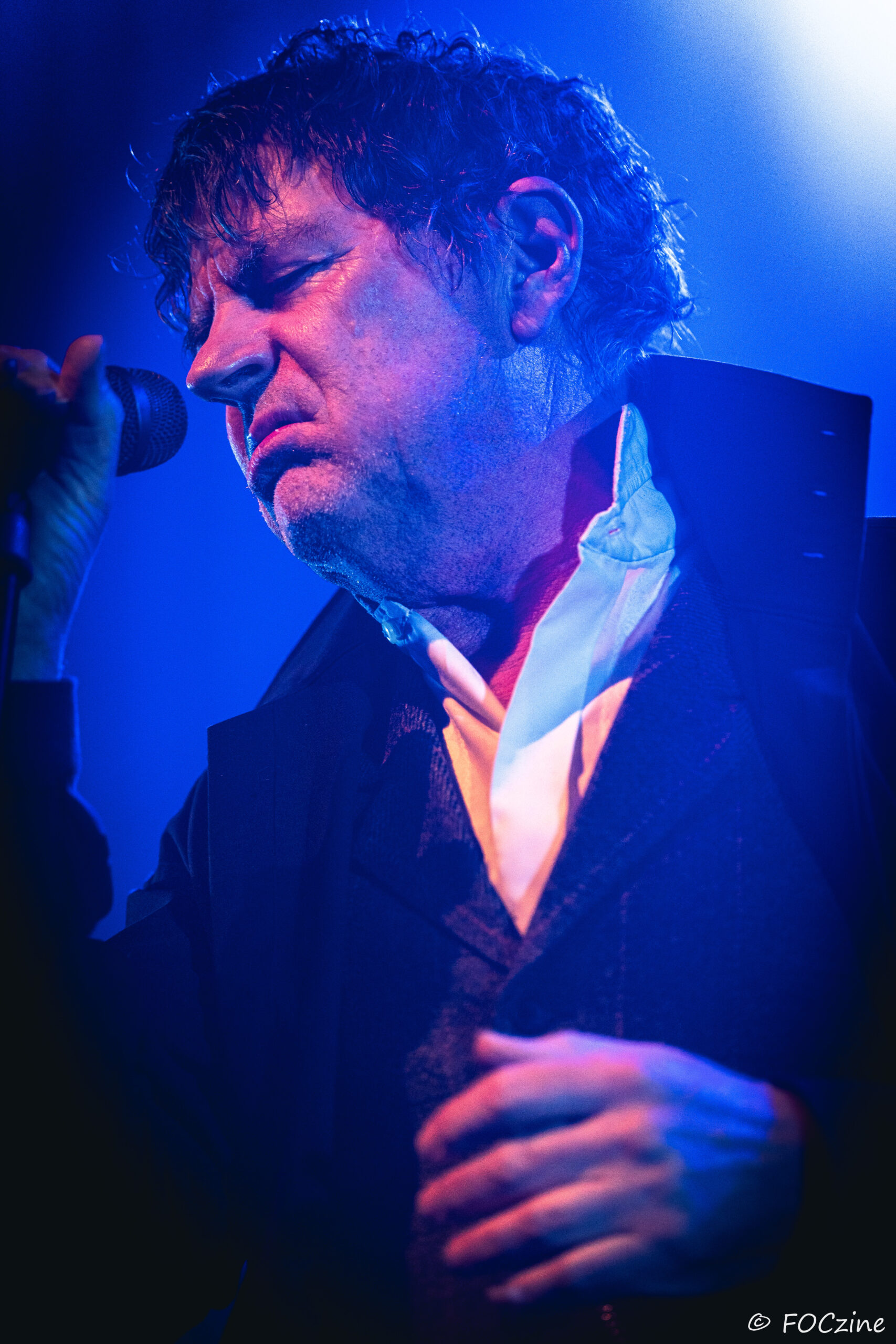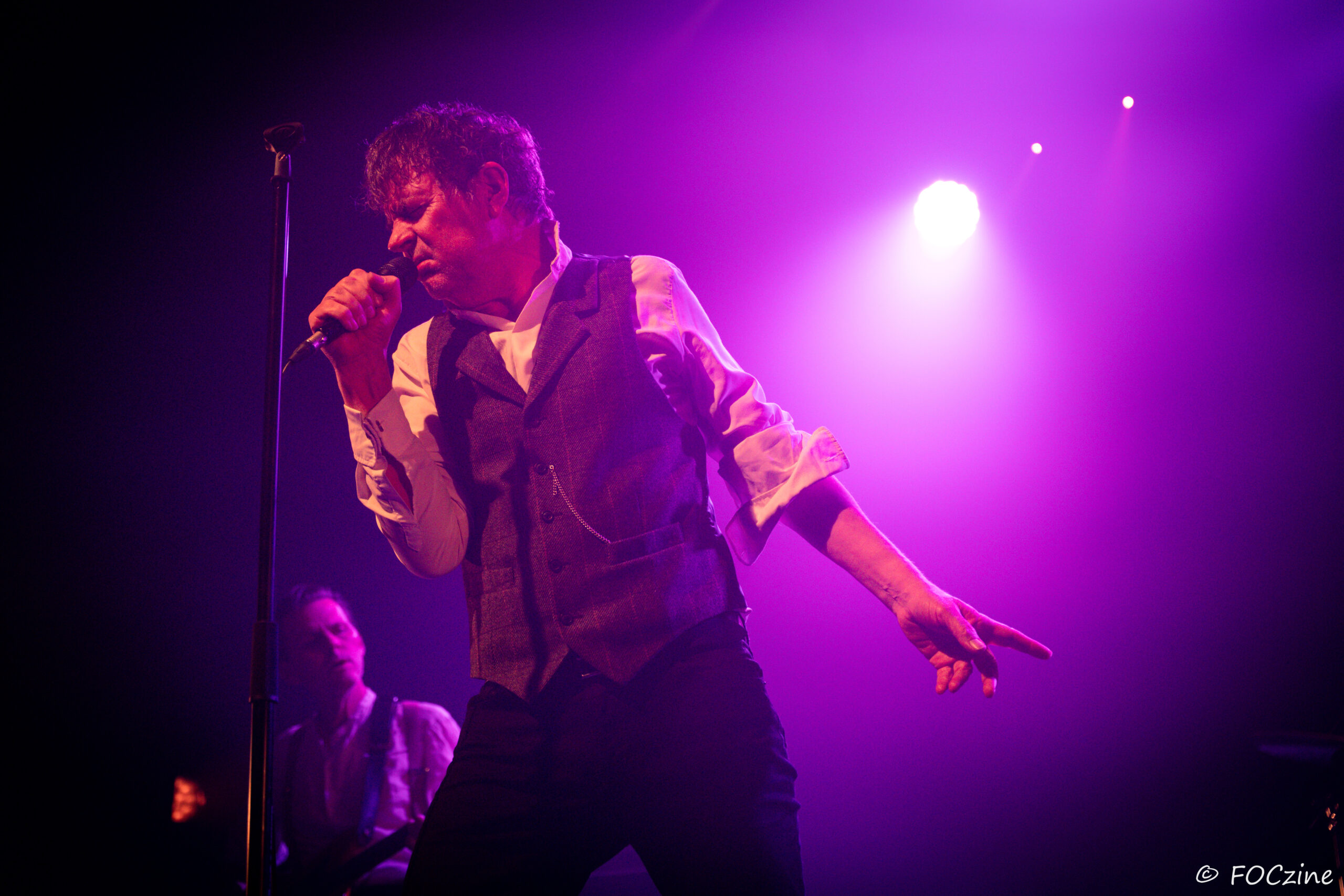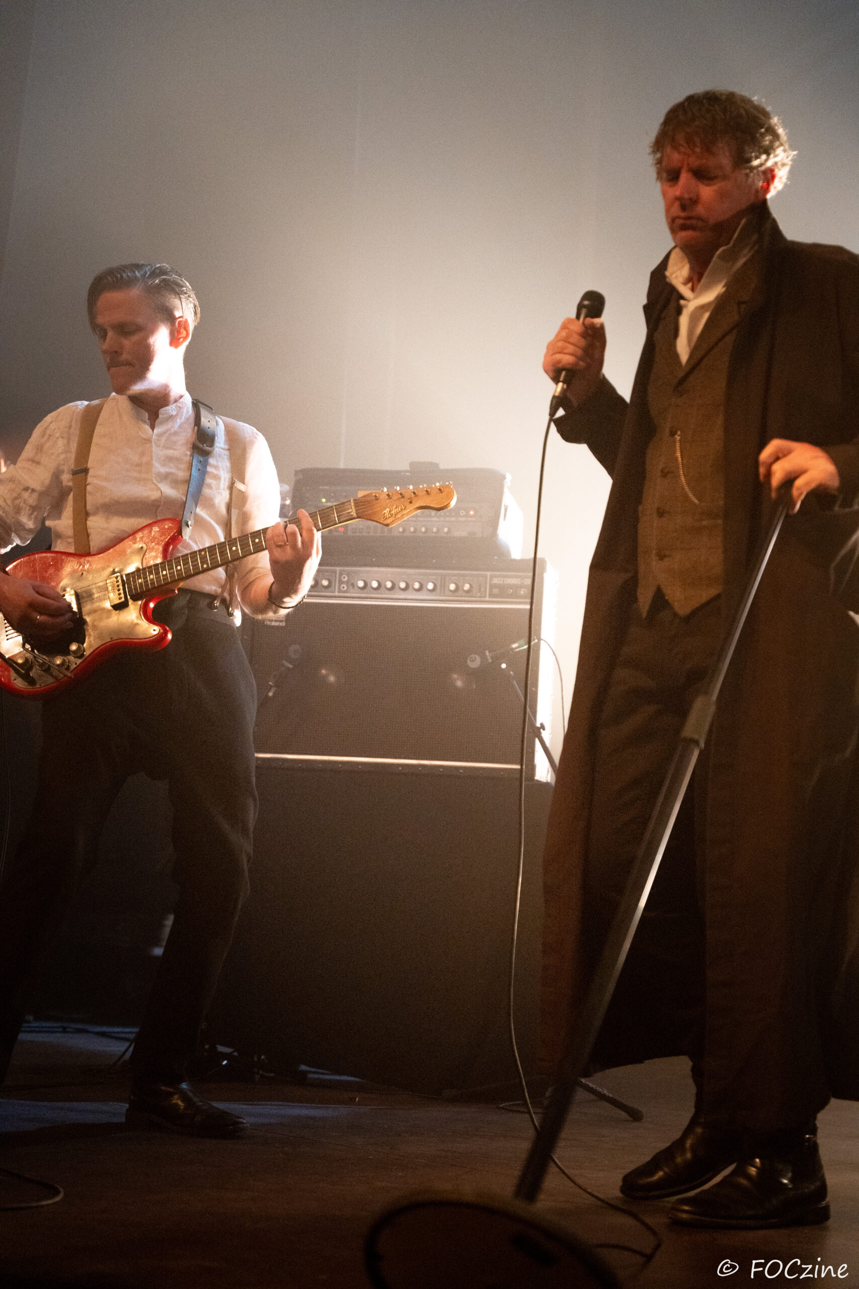 Et enfin Simon Huw Jones : le grand frère, la figure de proue, le capitaine au chant incarné. Un acteur entre en scène, redingote sur chemise blanche, col tendu. Passeur de temps, montre à gousset dans la poche du blaser et gestuel théâtral.
