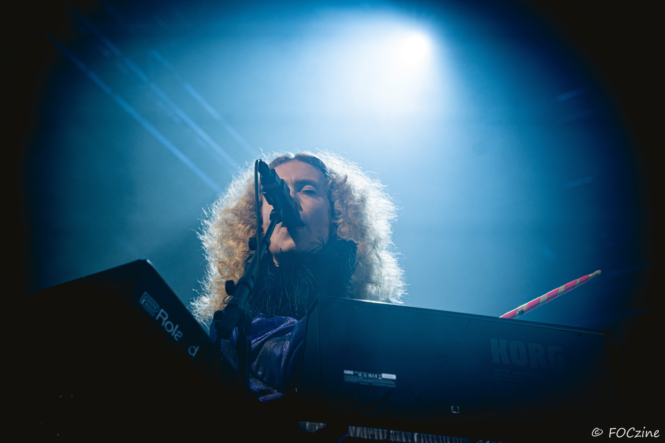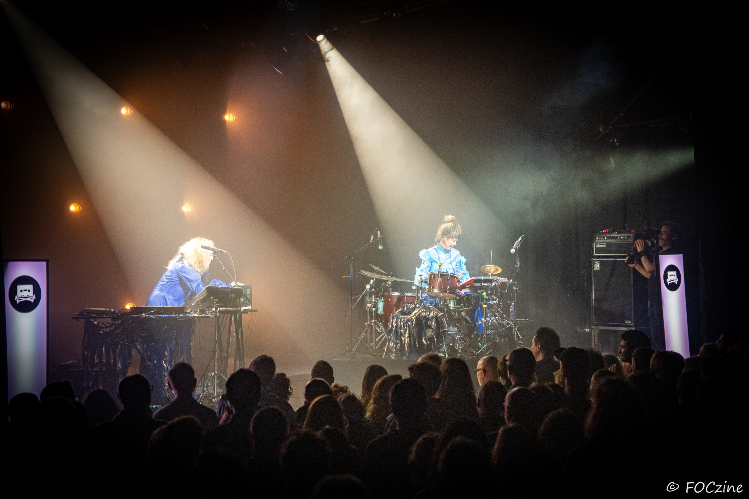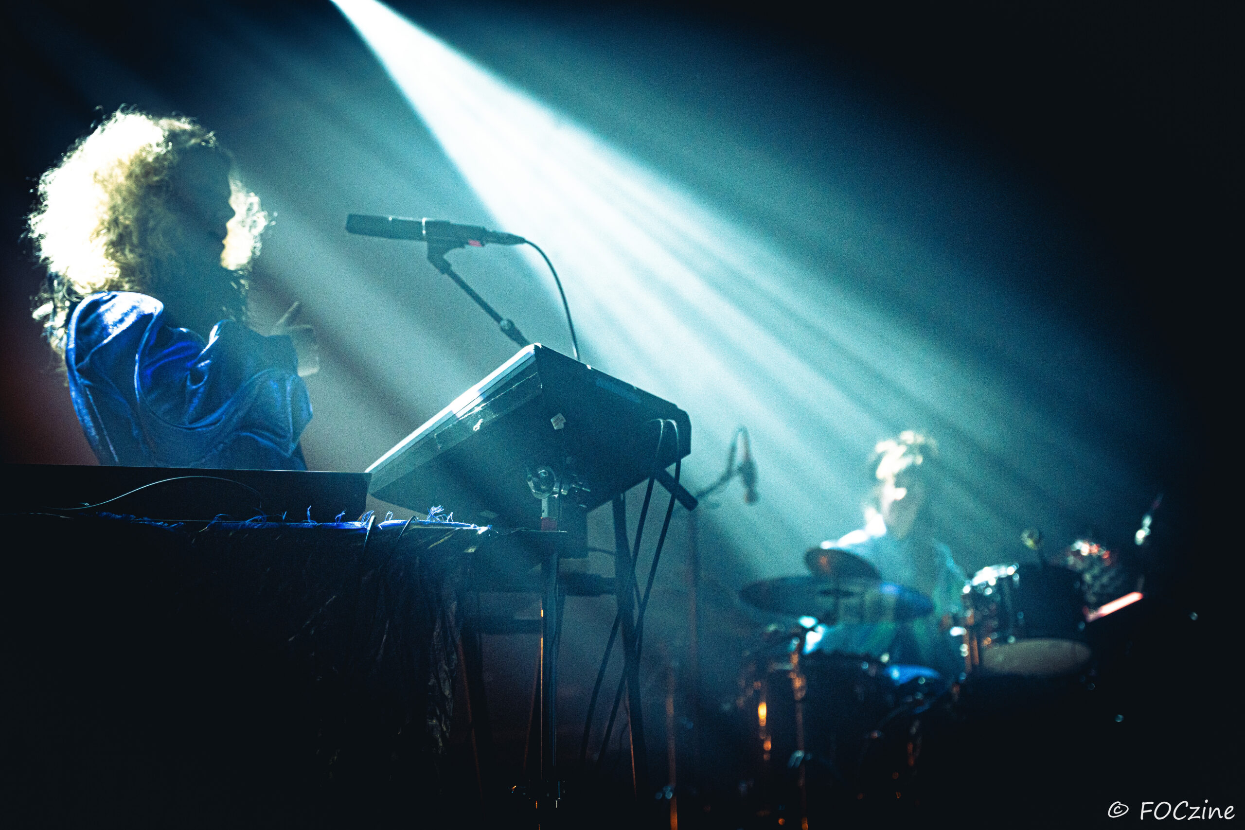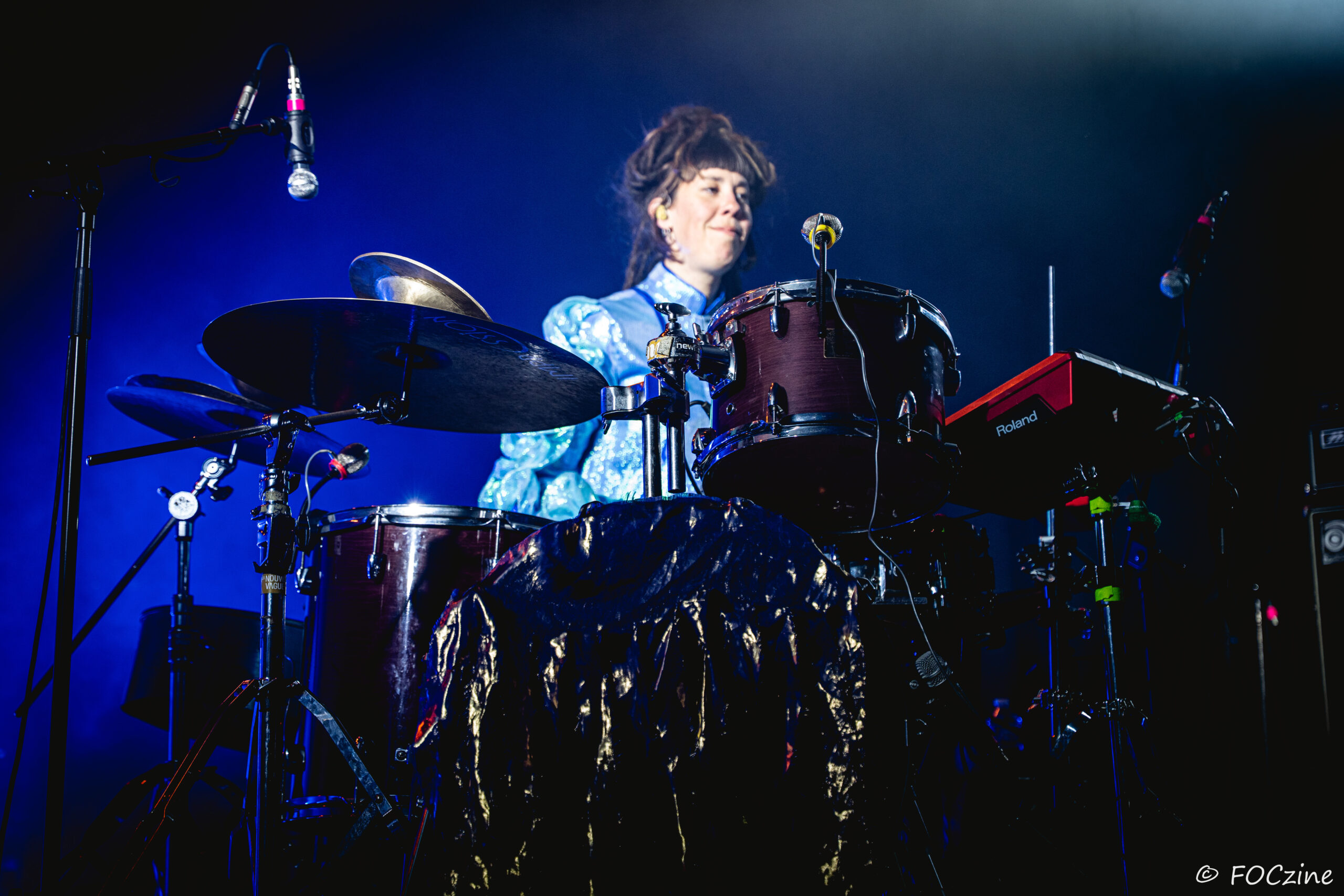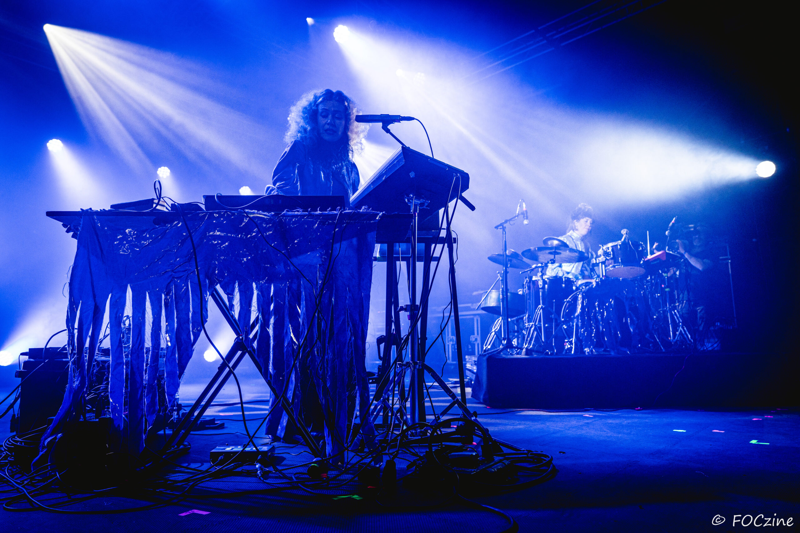 Rosa Ronsdorf et Nina Jong forment le duo néerlandais Spill Gold. Rosa chante et joue des synthétiseurs, tandis que Nina crée des rythmes percussifs hypnotiques. Explorant un univers musical mêlant krautrock, psychédélisme, synth pop expérimentale et musique électronique, elles composent des morceaux immersifs mêlant sons et rythmiques singuliers particulièrement mélodiques et dansants. Une fois qu’on a dit cela, on ne peut que vous encourager à écouter l’album Zaza (2024) où les deux musiciennes affirment une identité artistique unique. Manquerait plus qu’elles soient généreuses ! Féériques, vous voulez dire ! Rosa dans sa robe bleue, boa au cou, n’a rien d’une Cruella. Ses cheveux sont ébouriffés, car comme nous, ils sont électrisés et ne restent pas statiques. Le décorum bleu est envoûtant et lie les deux artistes, Nina arborant une salopette de la même couleur, en tissus de lumières. On se croit dans un conte pour enfants, nos yeux sont grands ouverts et nos oreilles toutes ouïes. C’est beau, ca dure, on est bien. Les Spill Gold renversent de l’or, elles sont nos muses du samedi qu’on voudrait encore entendre le dimanche, nos sirènes du port d’Amsterdam. J’ai un secret à vous dire, Rosa et Nina adorent la Bretagne : « c’est l’un de nos endroits préférés sur cette planète, on a rencontré des créatures magiques le long de la côte et on a aussi dégusté de véritables crêpes bretonnes ».