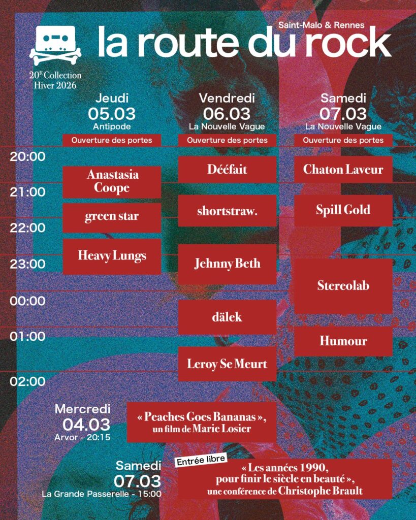 Tiré de l’Almanach du pêcheur breton, voici le déroulé des horaire de marée et des concerts annoncés pour La Route du Rock Hiver 2026, entre Rennes et Saint‑Malo – trop hâte de vous y retrouver ! Bonne pêche !