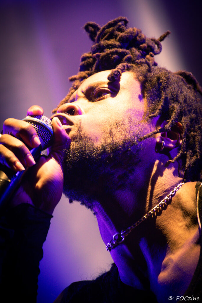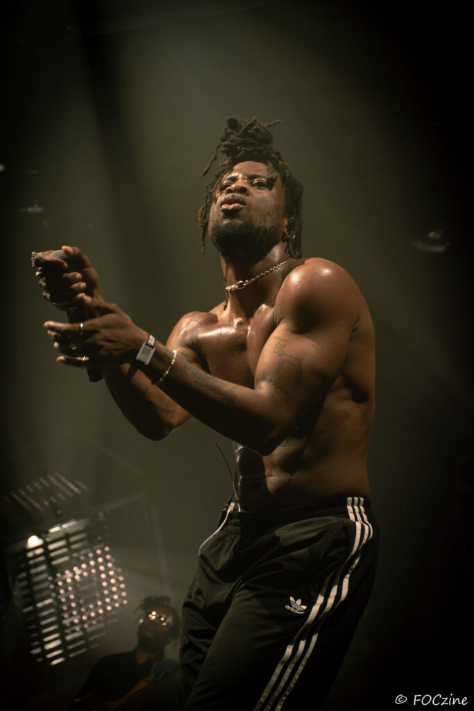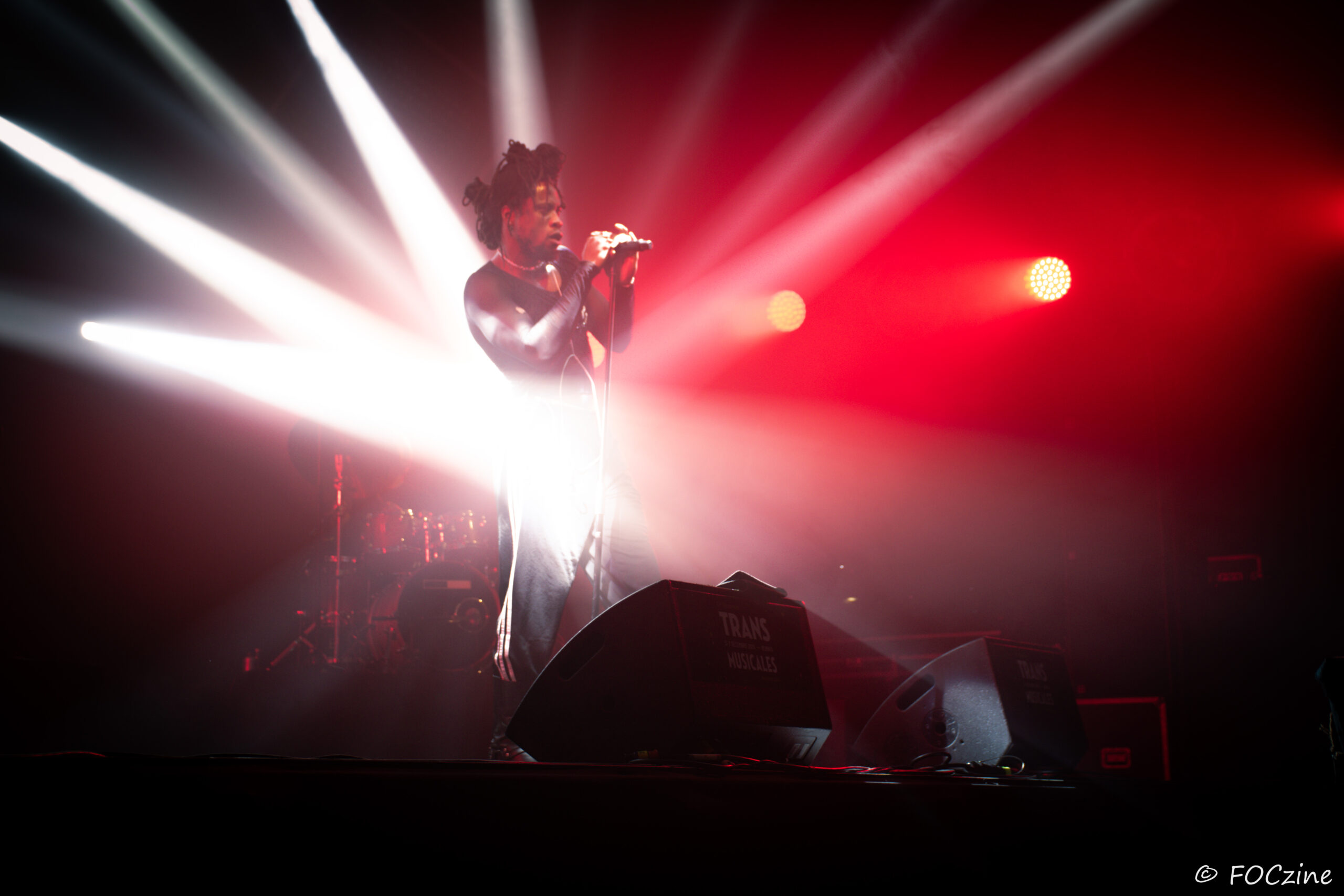 C’est avec OBONGJAYAR que je poursuis cette première soirée des Transmusicales. Il faut dire que l’artiste nigérian-britannique au style inclassable, mêlant afrobeat, soul, spoken-word et électronique est attendu. Sa singularité repose avant tout sur une voix très expressive, capable d’être tour à tour grave, rugueuse ou aérienne. À travers ses chansons, il explore des thèmes profonds comme l’identité, la diaspora, la spiritualité et les tensions sociales, en puisant dans son parcours personnel entre le Nigeria et le Royaume-Uni. Révélé par plusieurs EP remarqués, il s’impose pleinement avec son premier album Some Nights I Dream of Doors en 2022. Il confirme ensuite sa maturité artistique avec Paradise Now en 2025, un projet plus audacieux et affirmé. Ses collaborations avec des artistes comme Little Simz, Fred Again.. ou Danny Brown renforcent son statut d’artiste hybride et visionnaire de la scène contemporaine. Un atout de plus dans sa poche, ou du moins sous son Tee shirt, sa musculation. Il n’éprouvera aucune difficulté à hotter celui ci puis à taper du pied sur la scène et dans l’oeil d’un public conquis.